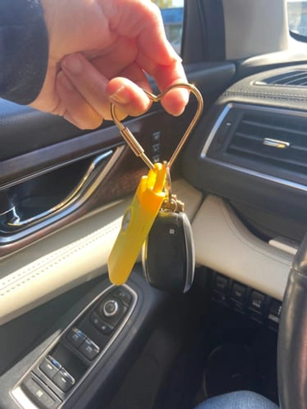 Dankzij de gouden karabijnhaak klik je de SheShafe moeiteloos aan je tas of sleutels. Jouw veiligheid, altijd dichtbij.